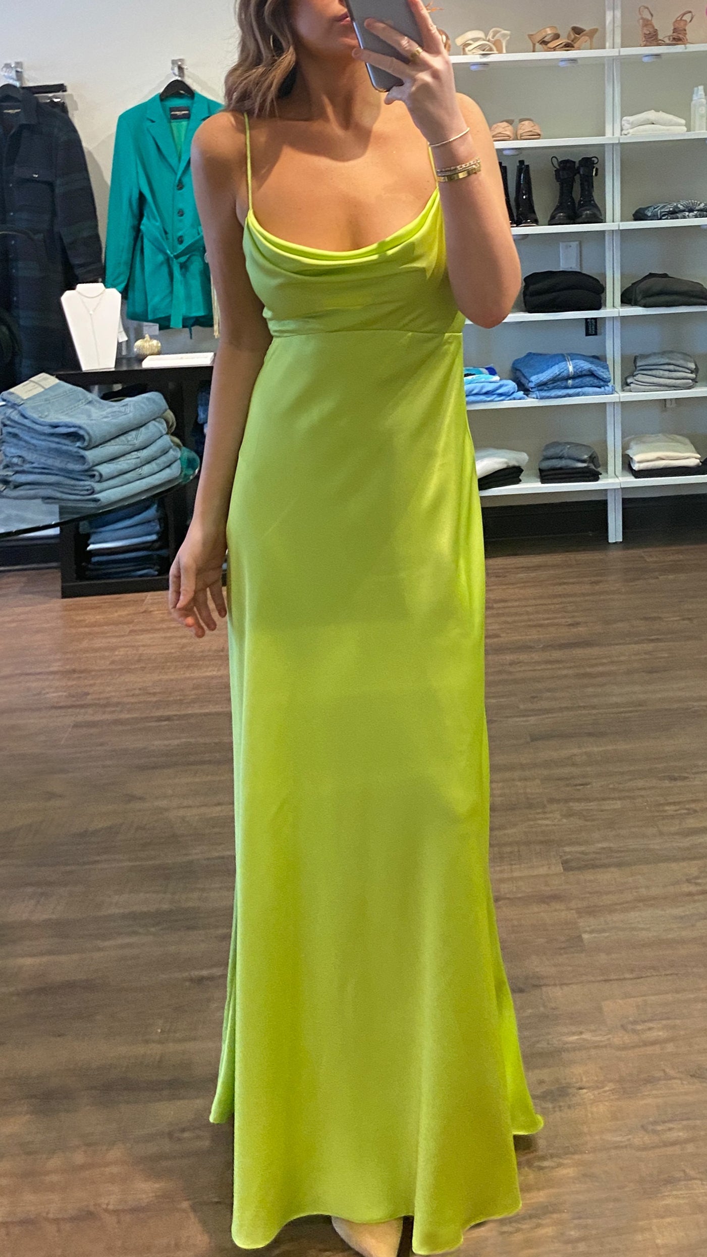 This strappy maxi-length dress is made of flowing satin.